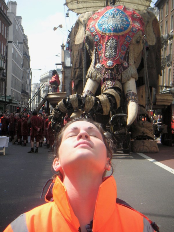 The Elephant puppet in the background is from the 2006 performance by Royal de Luxe of “The Sultan’s Elephant.” It was the biggest piece of free street theater ever performed in London. You can read more about the performance here: https://en.wikipedia.org/wiki/The_Sultan%27s_Elephant